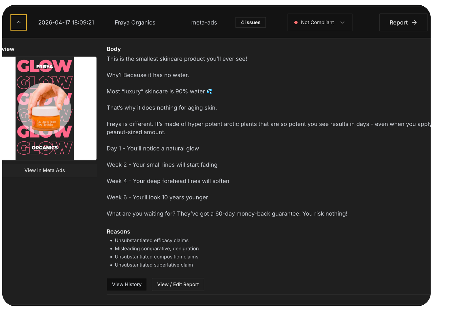 Your legal foundation. We continuously scan all your affiliate, creator posts, videos & paid ads against applicable regulations per jurisdiction. You stay in control of risks.